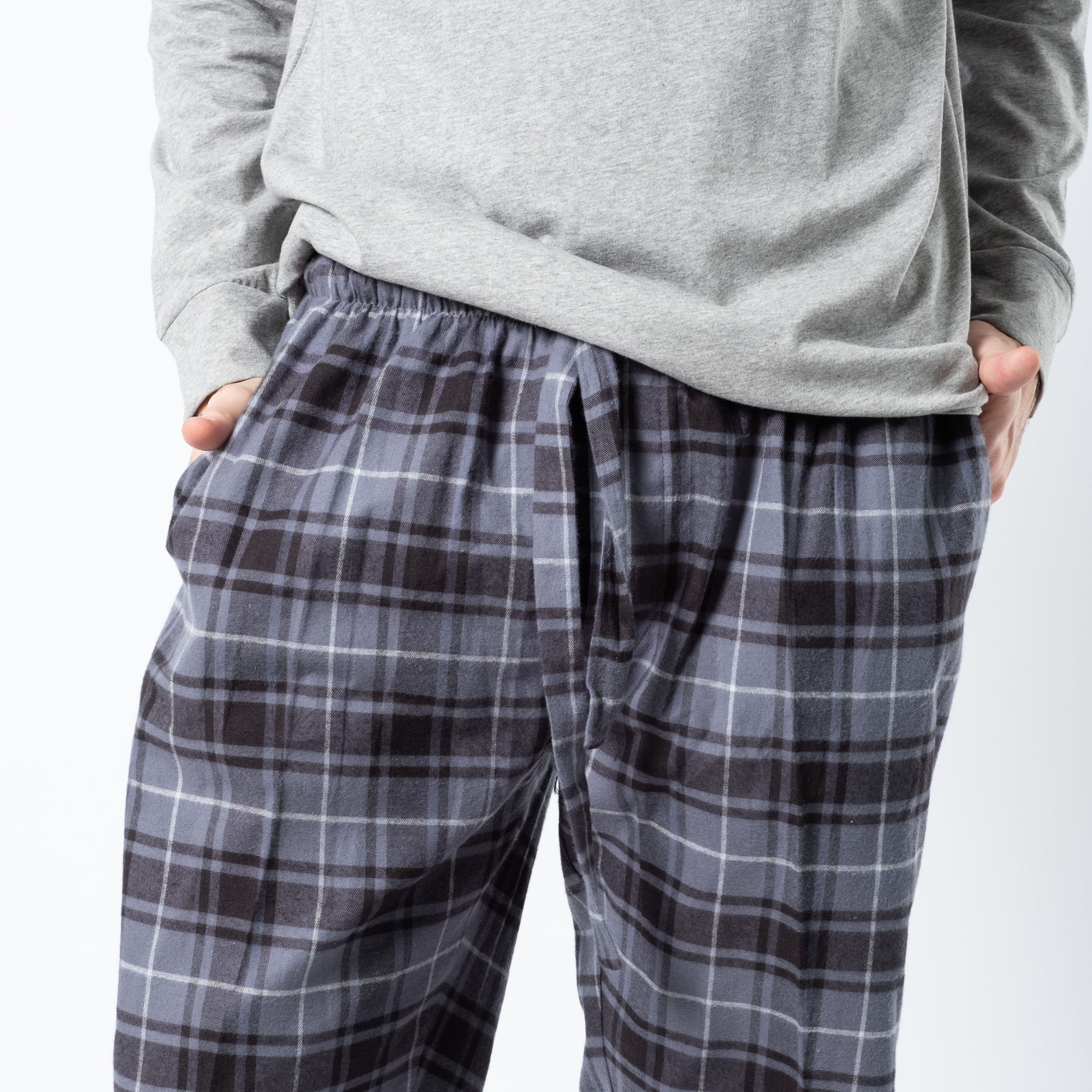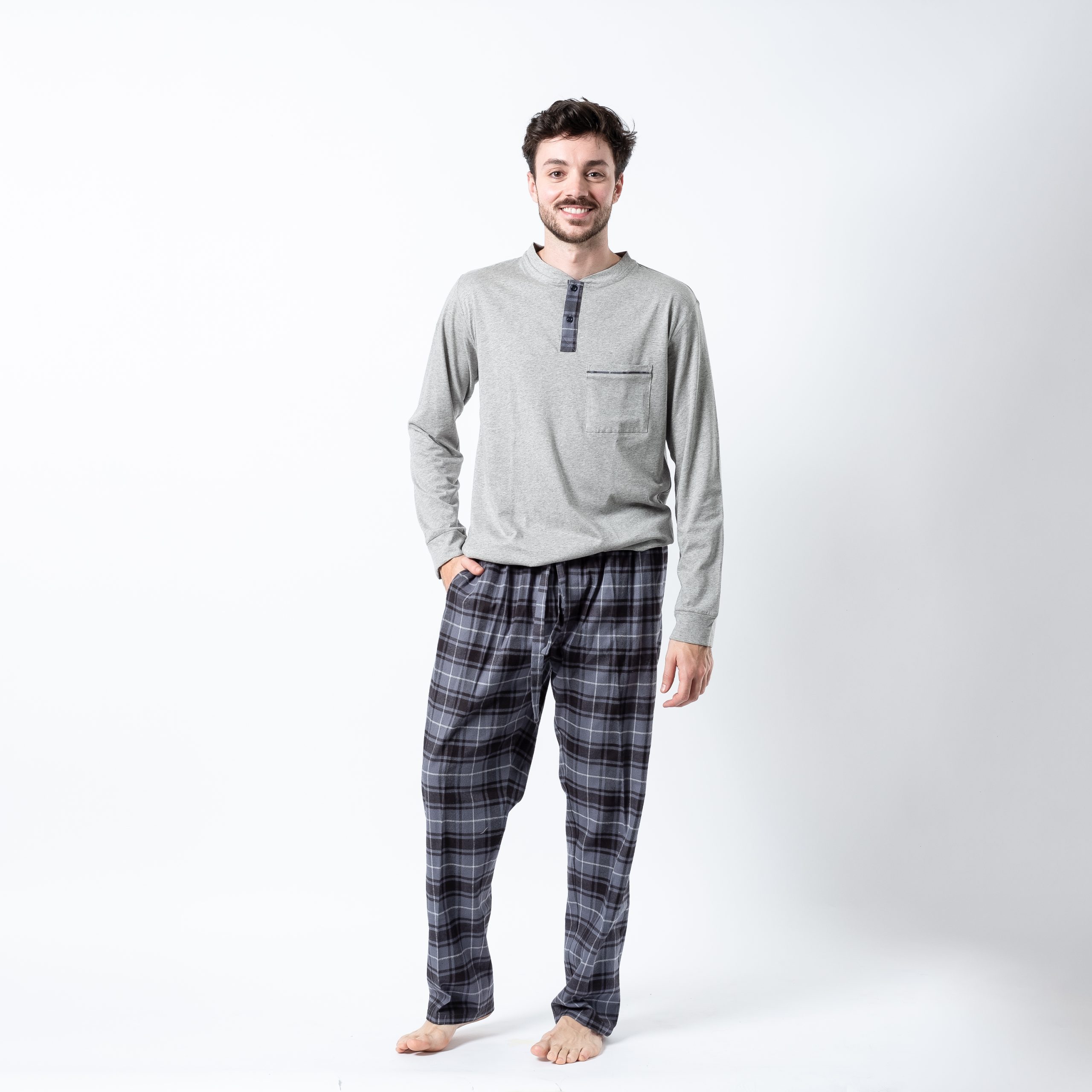 PIJAMA 100% ALGODÓN BUZO GRIS BOTONES CON BOLSILLO PANTALÓN FRANELA CUADROS